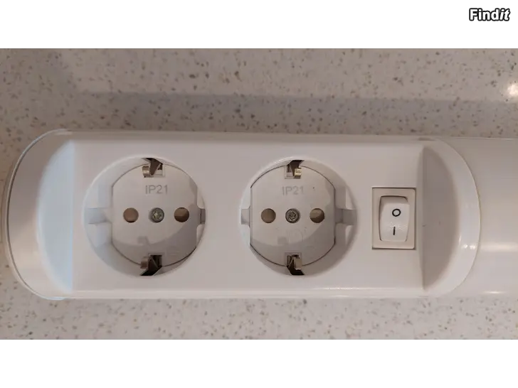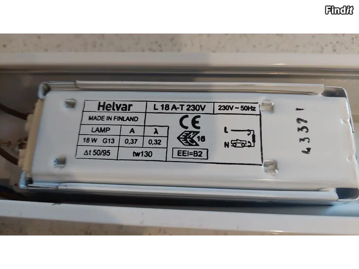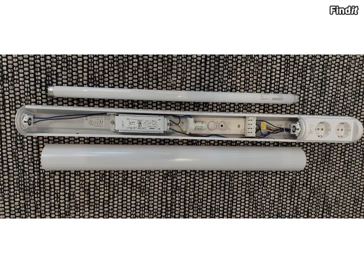 Säljes bänkarmatur Helvar med lysrör och två jordade uttag, kan installeras vänster / högervänt IP21.