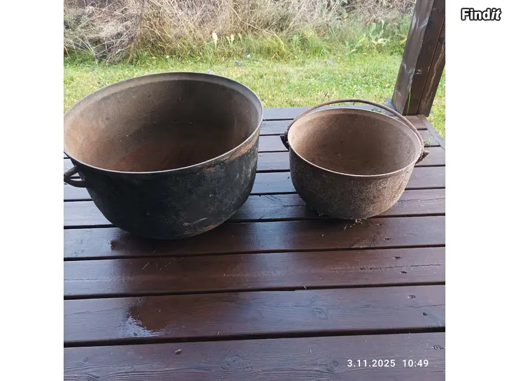 Isomman halkaisija 42 cm. Pienemmän n. 30 cm. Isommasta puuttuu sanka.