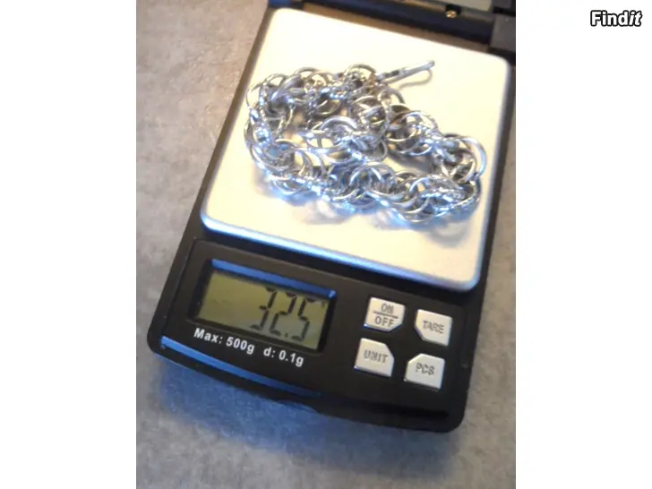 Pituus n.20cm, renkaan halk. 12 mm, paino 32,5g. Tämä rannekoru on vanhempaa tuotantoa, uustuotannon renkaan halk. on 8-9mm ja paino alle 20gr.