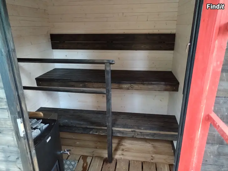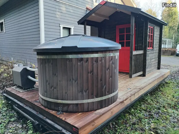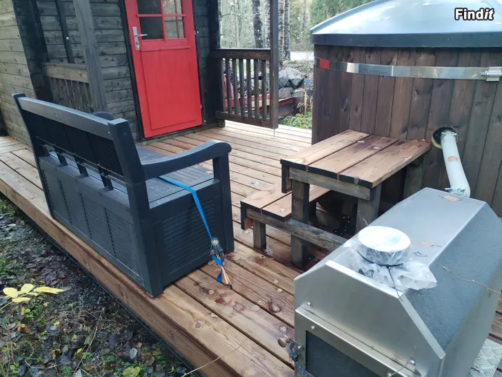 Vaihtolavan 3 x 6 m päälle rakennettu komea yhdistelmä ,jossa kevythirsisauna 40 mm:n hirrestä. Pohjamitat 2 x 2 m, Narvin tehokas kiuas ,integroidulla vesisäiliöllä. Plastweldin iso 6-8 hengen palju ,erillisellä kamiinalla ja kannella, myös portaat mukana. Täysin uuden veroinen paketti...sauna lämmitetty vain kerran ,kuten myös palju. Tässä talvi-iltojen iloksi mukava paketti. Helposti paikalleen , ei tarvi isoja pohjatöitä ,kunhan on vaan tasainen alusta. Hinta 8800e ,vaihdossa käy kuomullinen peräkärry, tarjoa.