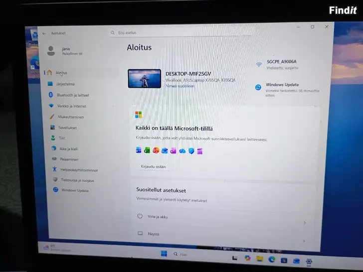 Kuvien mukainen Asuksen kannettava tietokone olisi kaupan.Asennettu Windows 11.N näppäin ei toimi eikä HDMI liitin.Akku kestää noin tunnin.Laturi kuuluu kauppaan sekä erillinen langallinen näppäimistö.Nouto Valkeakoskelta.