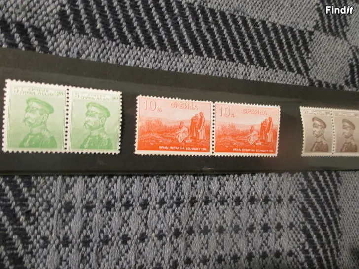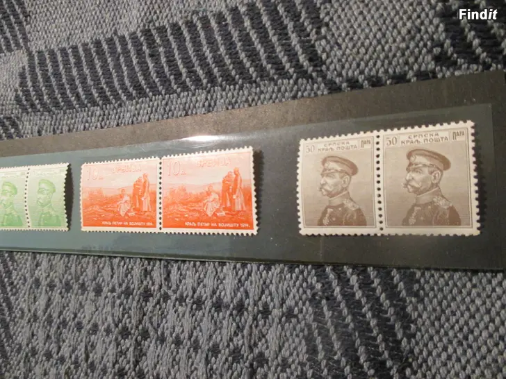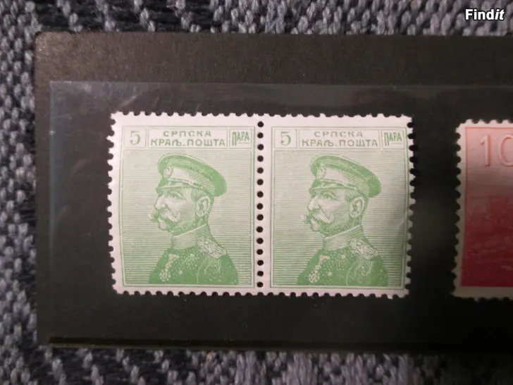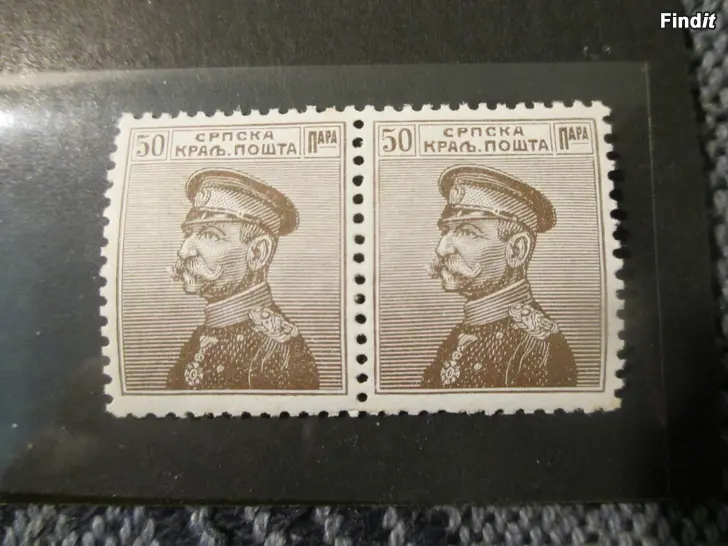 Kaksi kappaletta erittäin harvinaista postimerkkiä Serbian kuningas Pietari I:stä sotarintamalla. Maksuarvoltaan ne ovat 10 Paraa.