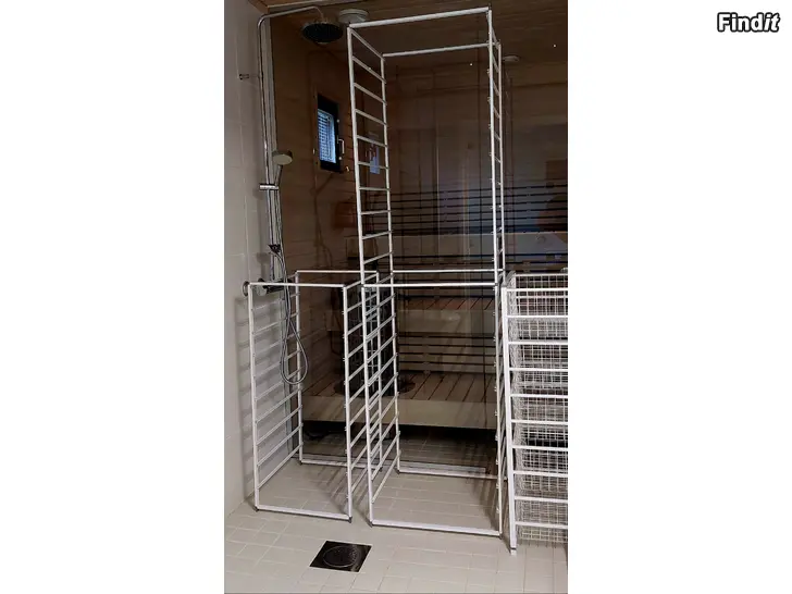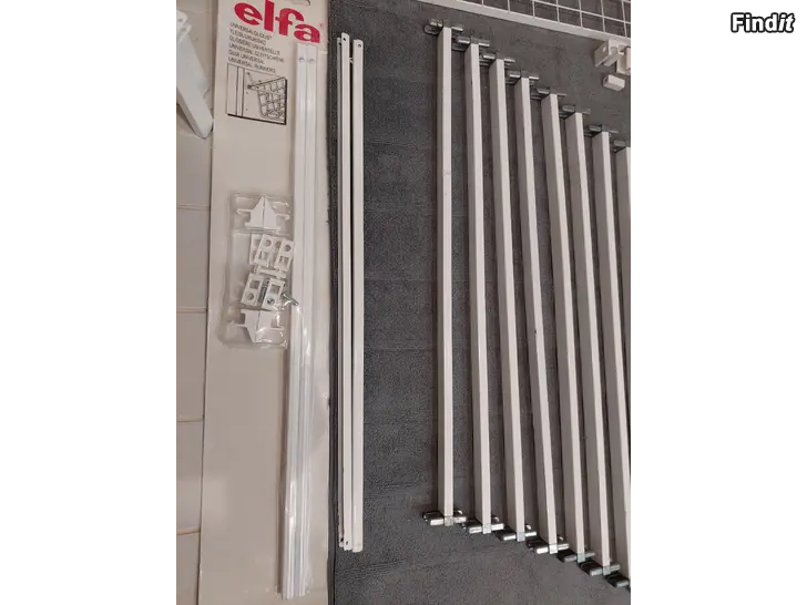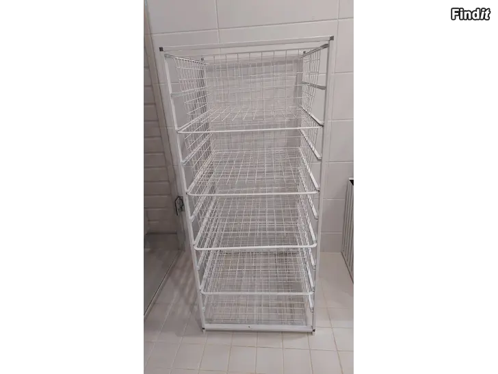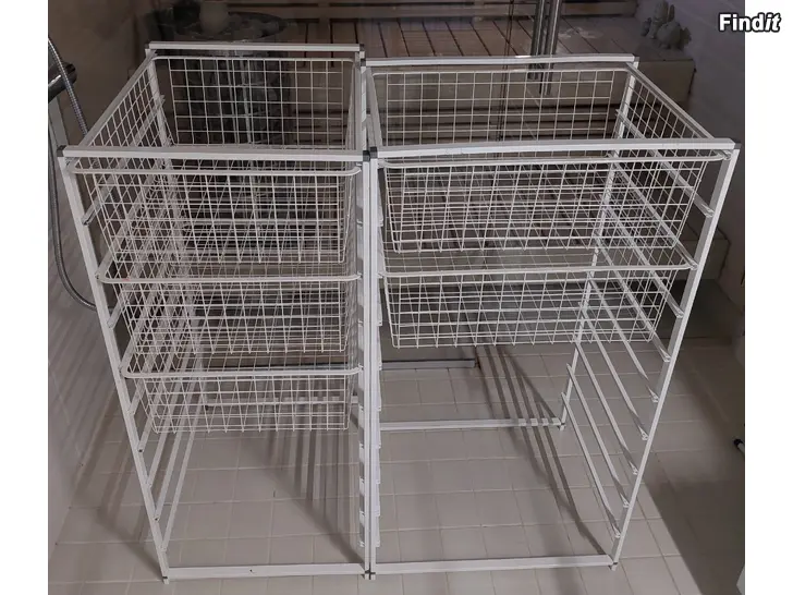 Myydään 104 cm korkea Elfa Classic koripaketti, johon kuuluu telinepäädyt, poikkituet ja viisi ulosvedettävää lankakoria.