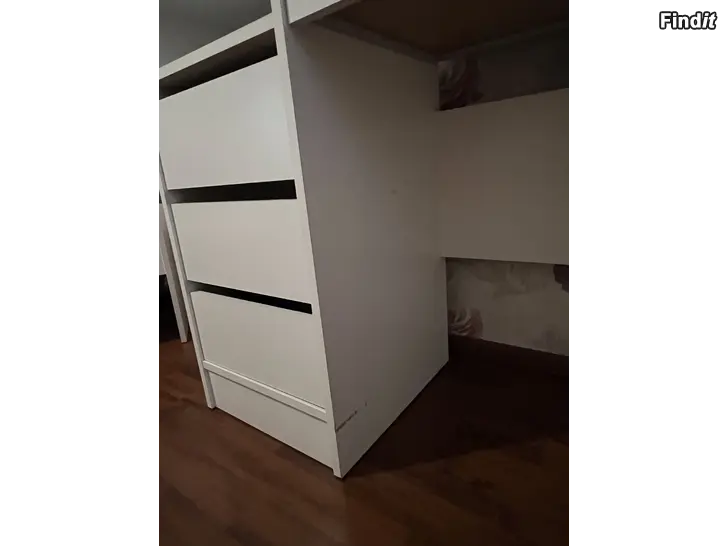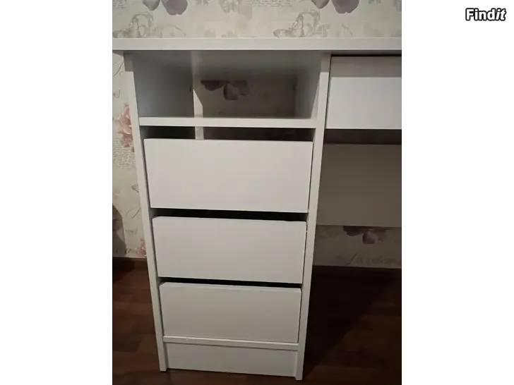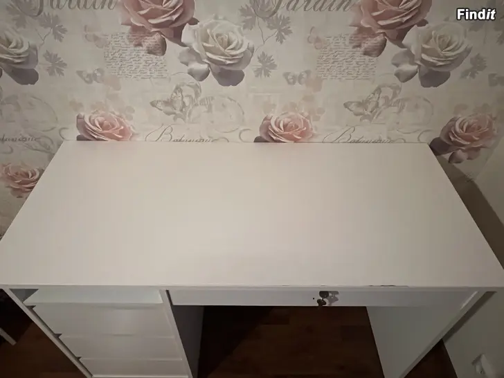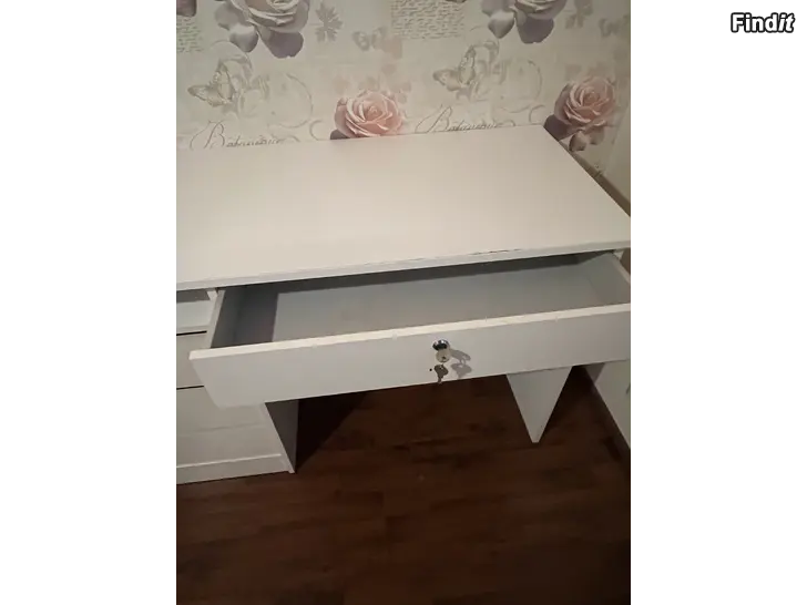 Valkoinen työpöytä, jossa on lukittava ylälokero ja kolme vetolaatikkoa. Pöytälevy tarjoaa tilavan työskentelyalueen. Pöytä sopii esimerkiksi koti- tai toimistokäyttöön. Ostettu Sotkasta pari vuotta sitten. Jokunen vähäinen käytönjälki löytyy,mutta perussiisti pöytä myös seuraavan omistajan käyttöön.