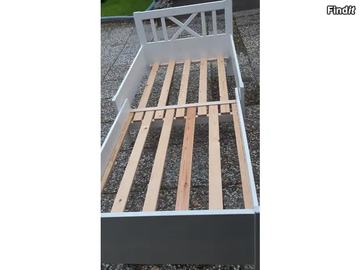 Utdragbar barnsäng. Minimilängd 110 cm, maksimilängd 180-190 cm. Bredd 80 cm. Spår av användning finns. Hämtas från Jakobstad. Kontant betalning.