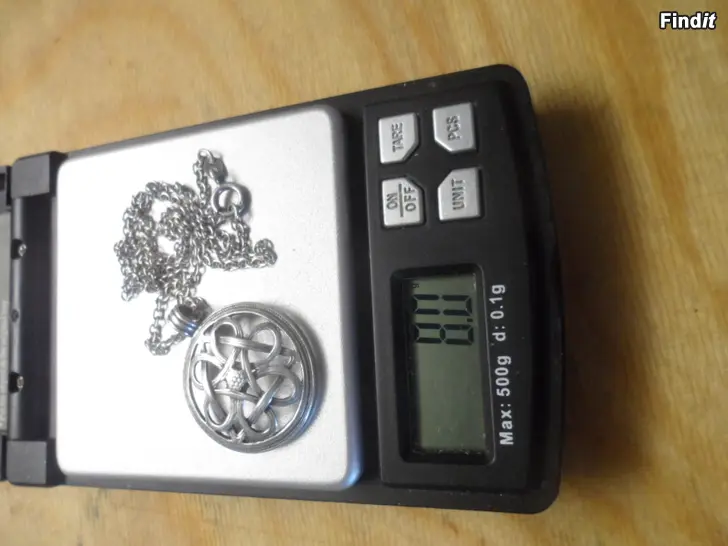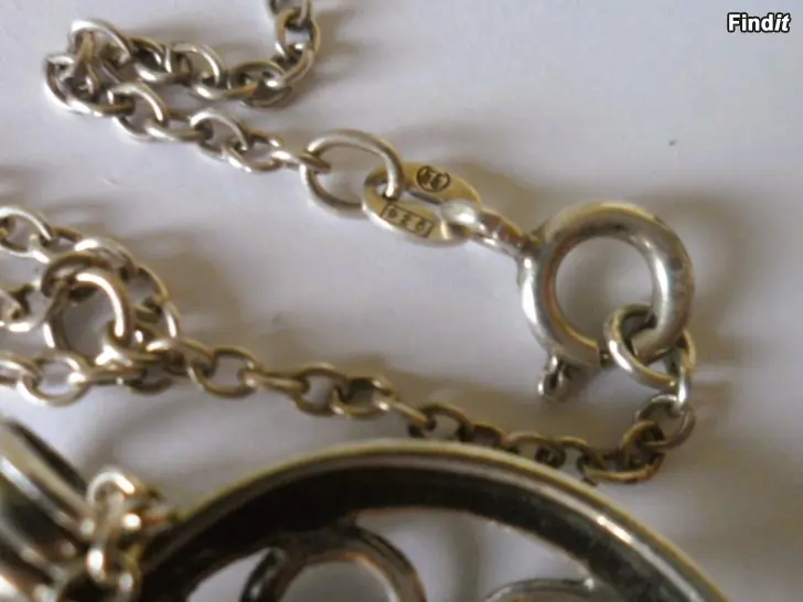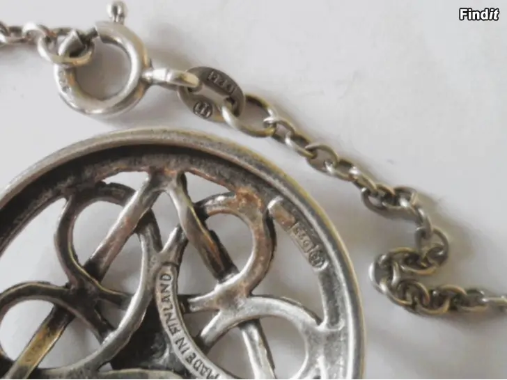 Hopeinen Kalevala Korun kaulakoru pituus 46,8cm, 44-46,8cm säädettävä. Paino 8g, leimat ketjussa KK, 925, 925, riipuksessa KK.925,KK, made in Finland.