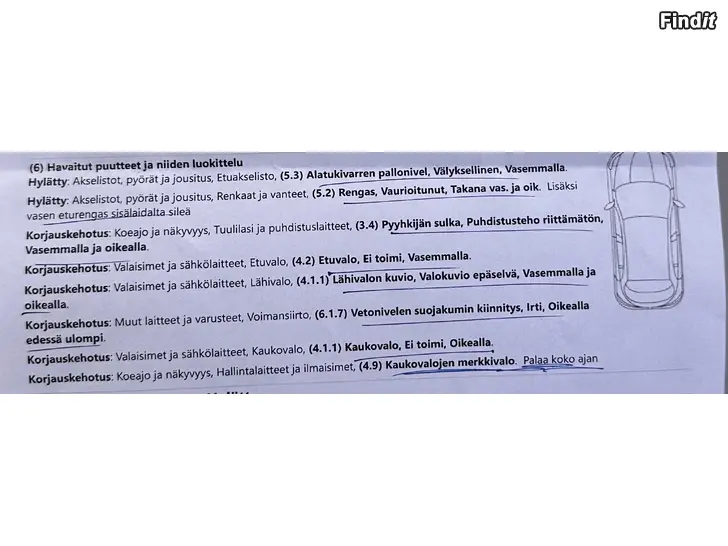 Toimiva, mutta katsastuksessa ilmeni rivi pienempiä vikoja joita en itse ehdi korjauttaa. Vaatii siis hieman ruuvaamista mutta ei mitään isompaa. Lista vioista kuvissa. Jälkitarkastus 1.12. mennessä.