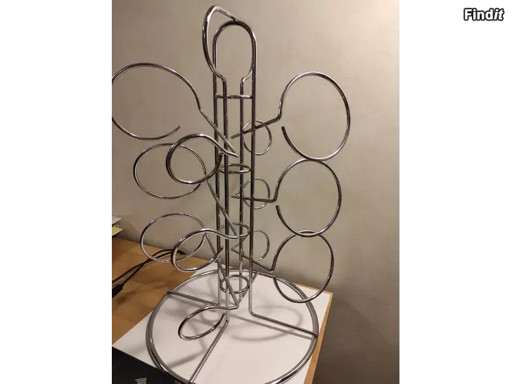 Metallinen viinipulloteline. Sopii kuudelle pullolle. Korkeus 45cm. Hyväkuntoinen
