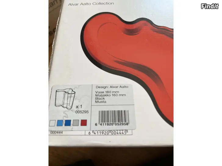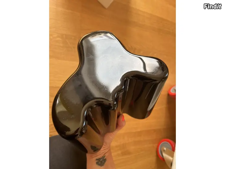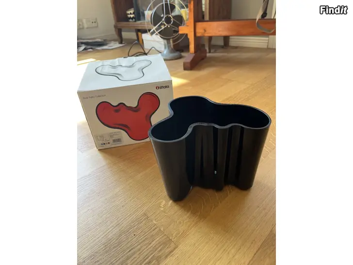 Moitteeton Iittalan musta Aalto-maljakko 160mm. Ei reunarikkoja tms. Pohjassa konesigneeraus, pohjakuvassa näkyvät ”jäljet” ovat heijastumia. Maljakko ei ole ollut maljakkokäytössä, ja säilytetty pitkälti alkuperäisessä laatikossaan.