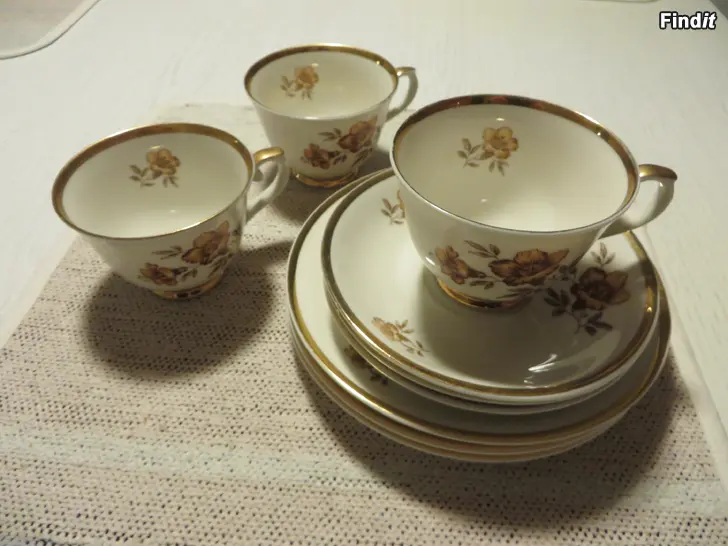 Kolme kpl Myrna-kahvikuppeja, lautasineen.