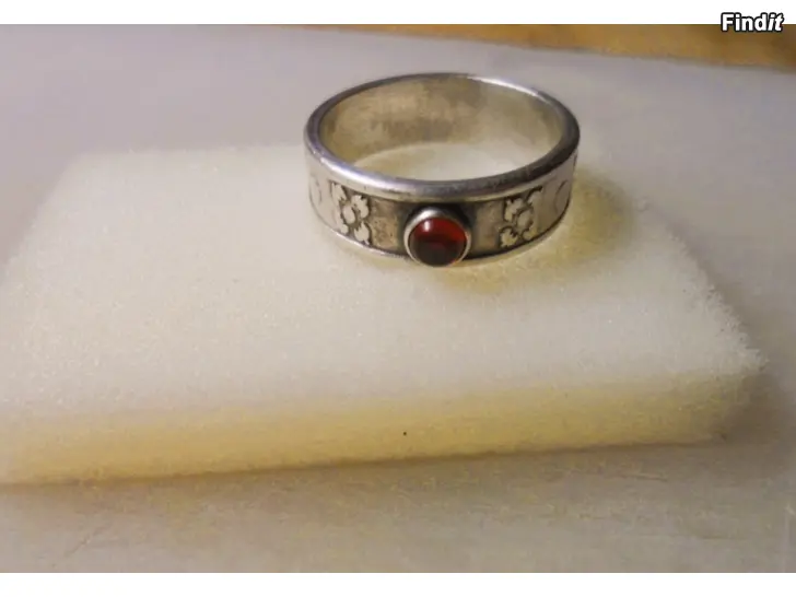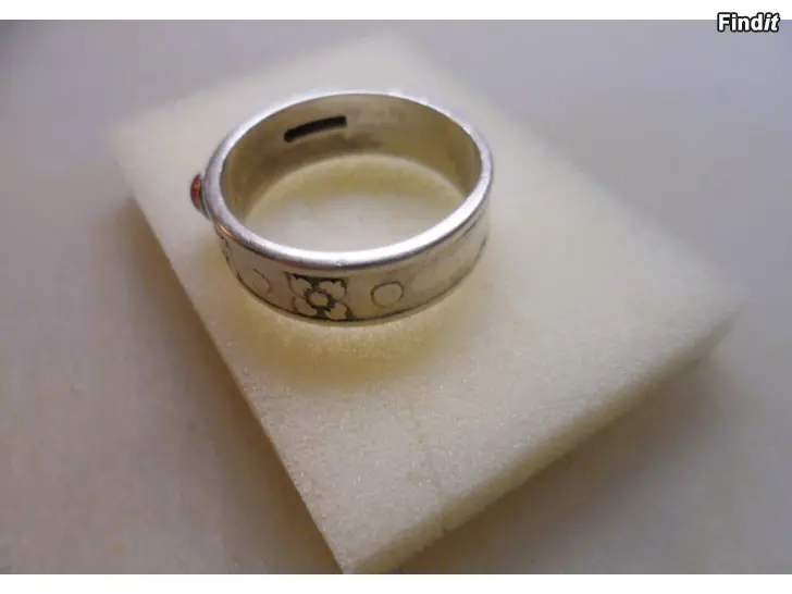 Hopea/punainen granaatti. Leveys 7mm, paino 6,3g. Koko 19,5. Leimat: KK, 925, B9=v.2003. Ei kaiverruksia.