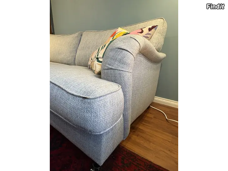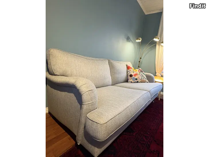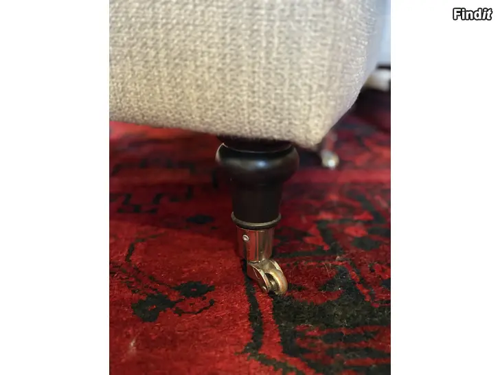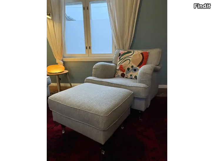 Grå soffa och fåtölj med fotpall i howard stil säljes.