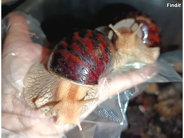 Lissachatina immaculata var immaculata kotiloita, helmikuussa 2025 kuoriutuneita. Kokoa nyt n. 8-9cm.