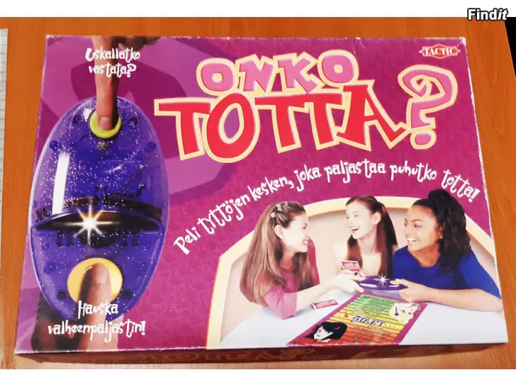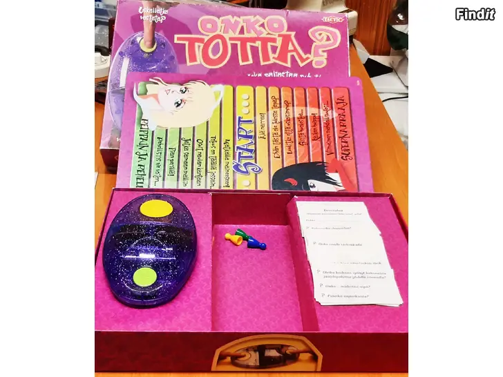 Pelin sisältö: 1 valheen paljastin toimiva 2 paristolla, pelilauta, 39 onko totta?-kysymys korttia, 10 kutsu korttia, 3 pelinappulaa, ja säännöt.