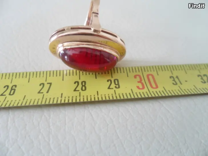 Kultainen sormus, jossa iso viininpunainen kivi, ehjä ja puhdas