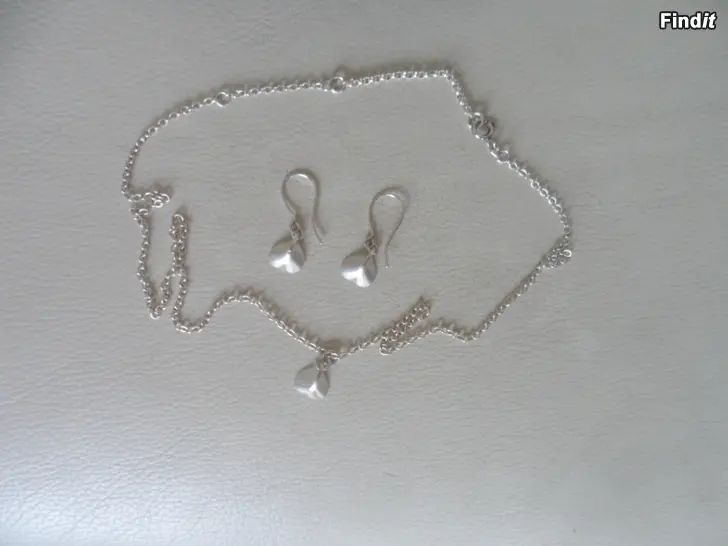 Korvakorut pituus n.28mm, leimat koukuissa KK, 925. Kaulakoru 50,5cm, 42 - 45 - 50,5 cm säädettävä, leimat 925, KK, vene. Uudenveroisessa kunnossa. Hinta yhteensä.