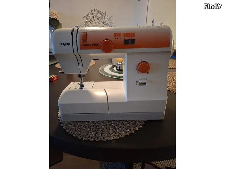 Pfaff Hobby 4240. Säädettävä tikinpituus, 5 yksittäistä neulan pistoa ja 5 kaksoisneulan pistoa. Kolmivaiheinen napinläpi ja vapaavarsi.