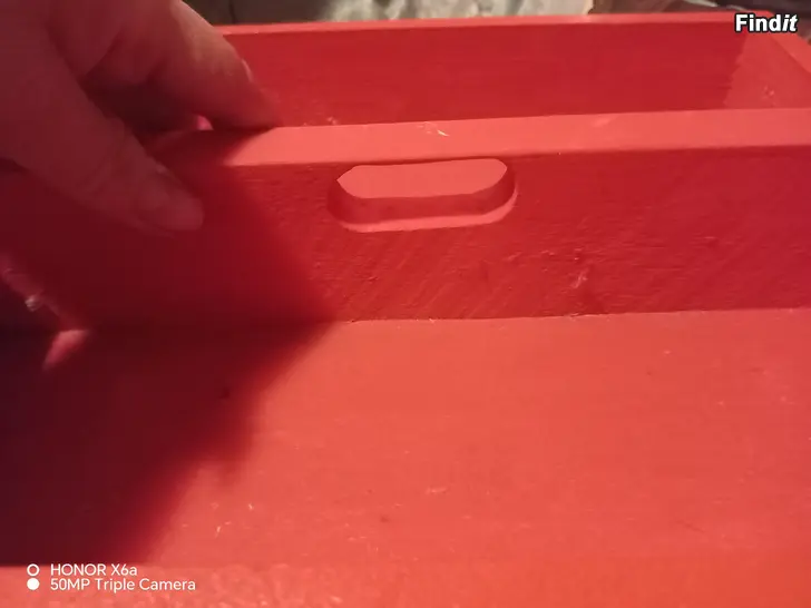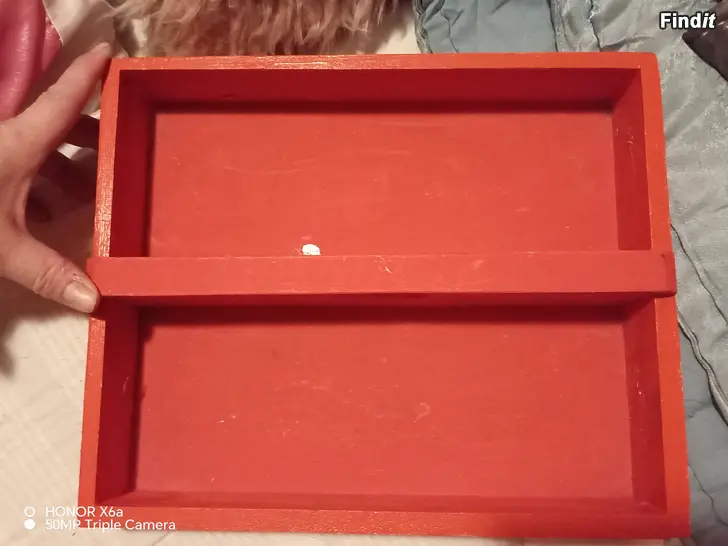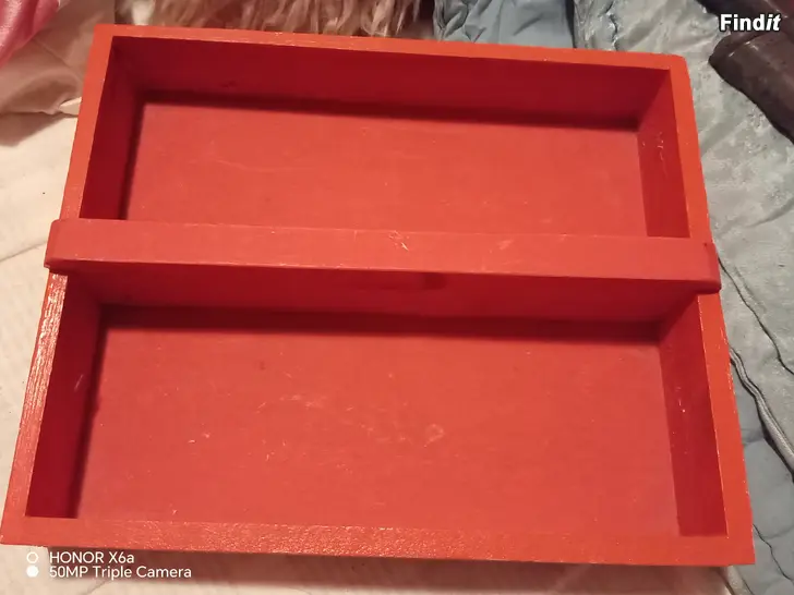 Vanha puulaatikko kahvalla, jaettu keskeltä kahtia. Työkaluille , aterimille... Punaiseksi maalattu, söpö.
