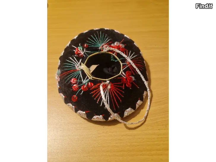 Säljer en liten svart sombrero med broderade detaljer i rött, grönt och vitt samt glittriga paljetter. Hatten har en silvrig kant och ett snöre för att fästa. Perfekt som dekoration eller accessoar till temafest.