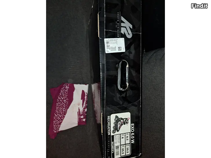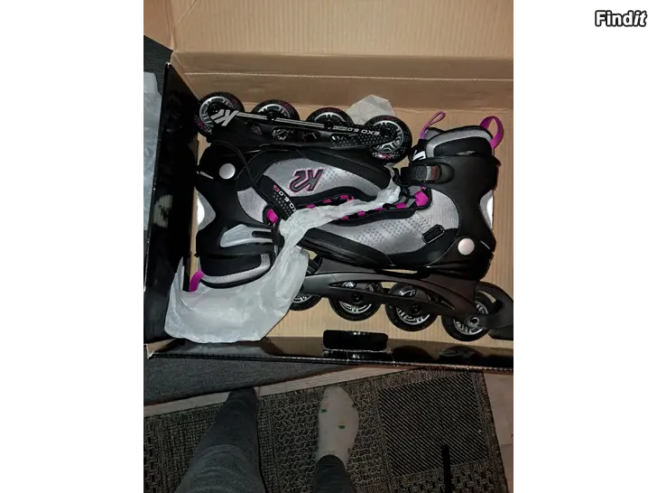 Laatikossa olevat K2 rullaluistimet. Kerran pidetyt eli ovat melkeinpä uudet.