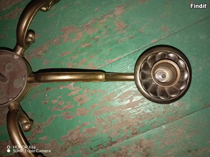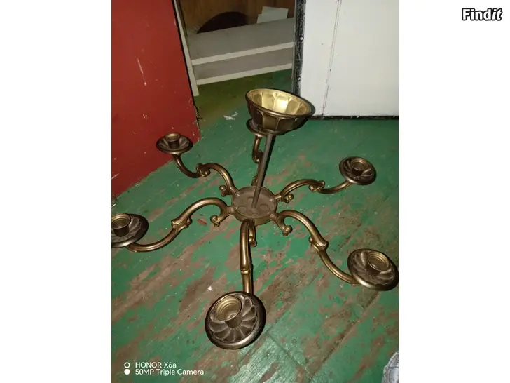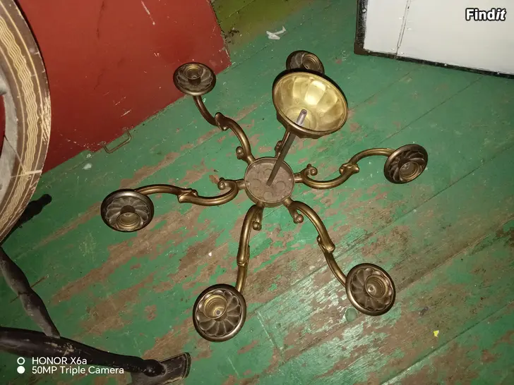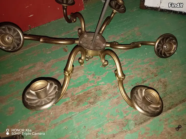 Painava vanha messinkinen kattokynttiläkynttilälkruunu.