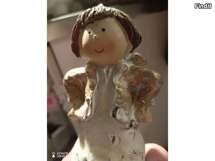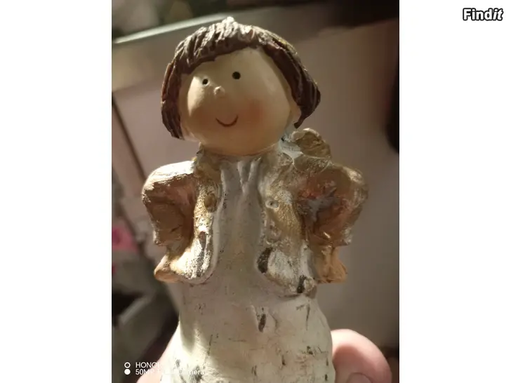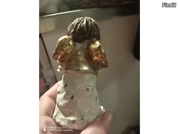 Kaunis pikku enkeli. Kädet vyötäröllä ja kultaiset siivet., kultainen takki ja valkoinen mekko. Korkeus arvio noim 10cm.