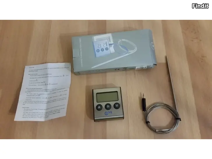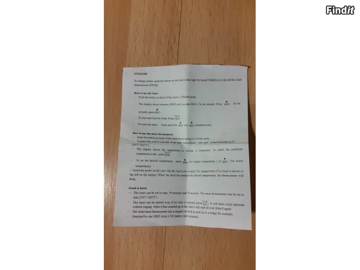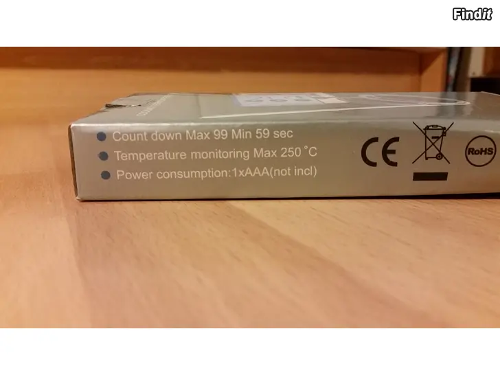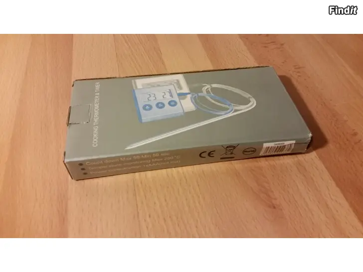toimii, lämpömittari jossa mahdollisuus asettaa hälytys kun saavutettu haluttu lämpötila. Toimii myös kellona. Takana kytkin. Toimii paristolla 1kpl AAA / ei ole mukana