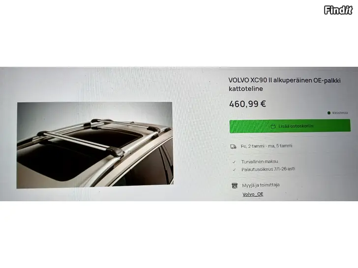 HUOM! Alle puoleen hintaan! UUSI alkuperäinen tehtaanpaketissa oleva käyttämätön VOLVO XC90 katto/takkateline sopii 2016- mallisiin ja siitä eteenpäin. Kuten kuvasta näet hinta on 460,99€ mutta tämän saat alle puoleen hintaan 220€/netto. Nyt kannattaa olla nopea, ei varauksia vaan ensimmäiselle myyn. Tarvittaessa voin myös lähettää postimaksua vastaan.