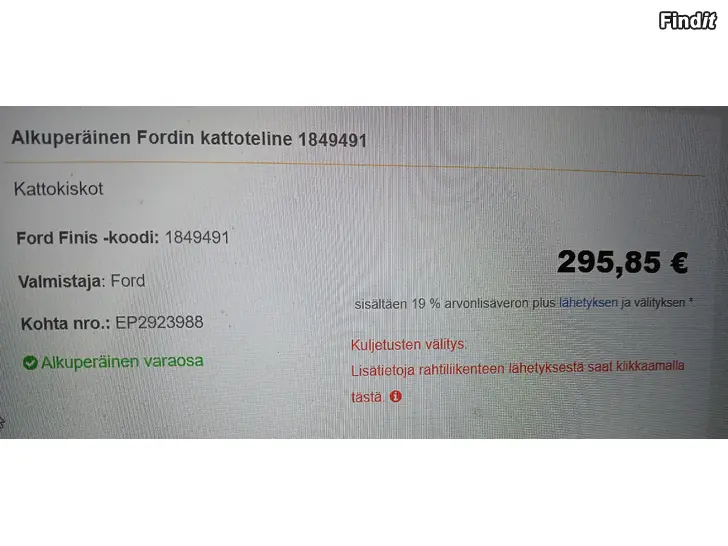 HUOM! Puoleen hintaan! UUSI alkuperäinen tehtaanpaketissa oleva käyttämätön Ford Transit/Tourneo Connect katto/takkateline sopii 2013- mallisiin ja siitä eteenpäin. Kuten kuvasta näet hinta on 295,85€ mutta tämän saat alle puoleen hintaan 150€/netto. Nyt kannattaa olla nopea, ei varauksia vaan ensimmäiselle myyn. Tarvittaessa voin myös lähettää postimaksua vastaan.