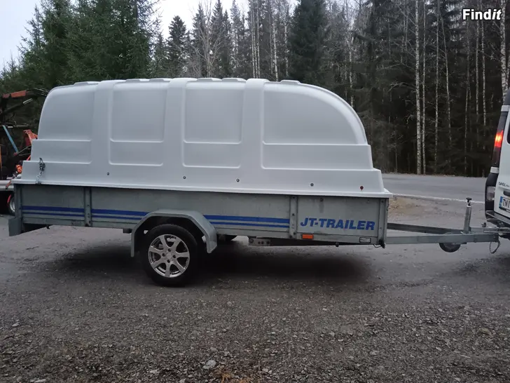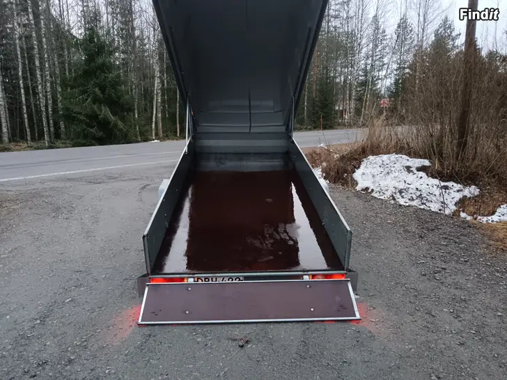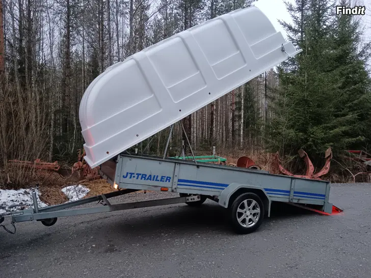 Jt-trailerin valmistama peräkärry. Lavan koko 150cm x 350cm laidan korkeus 35cm. Akseli lehtijousilla, kesärenkaat aluvanteilla. Kippi kaasujousilla. Kuomu ehjä. Voidaan myös vaihtaa alumiinivanteisin, akkuihin yms. Mielenkiintoiseen. Edullinen rahti voi myös onnistua.
