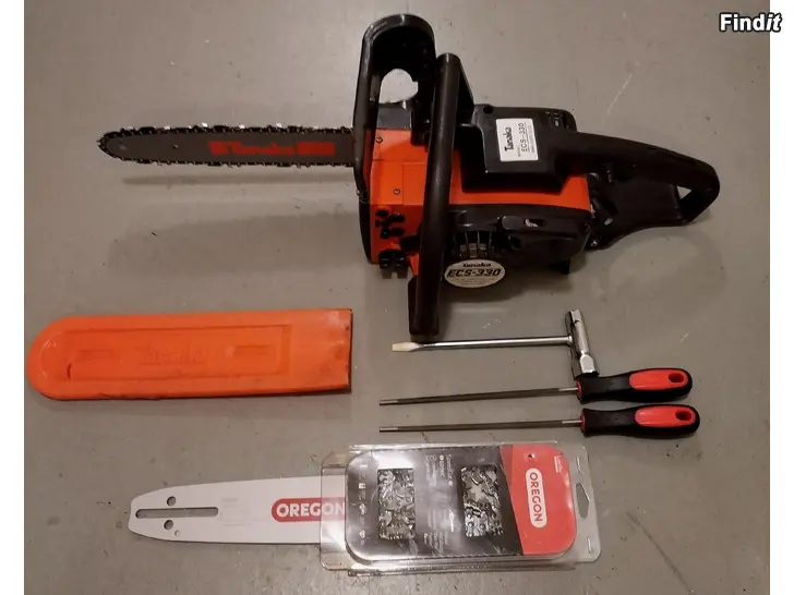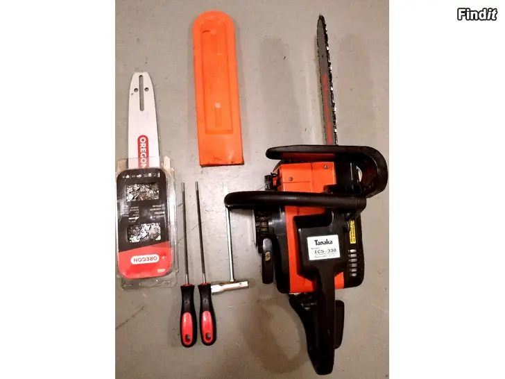 Tanaka moottorisaha +kaikki kuvassa näkyvät tarvikkeet. Saha ollut vähällä käytöllä, lähinnä varasahana.