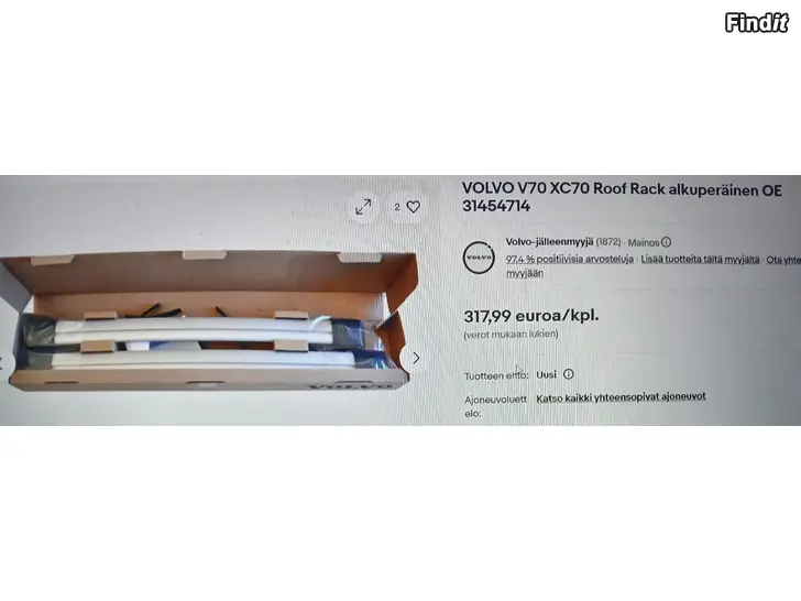 HUOM! Alle puoleen hintaan! UUSI alkuperäinen tehtaanpaketissa oleva käyttämätön VOLVO V70/XC70 katto/takkateline sopii 2008- mallisiin ja siitä eteenpäin. Kuten kuvasta näet hinta on 317,99€ mutta tämän saat alle puoleen hintaan 150€/netto. Nyt kannattaa olla nopea, ei varauksia vaan ensimmäiselle myyn. Tarvittaessa voin myös lähettää postimaksua vastaan. Parhaiten mut tavoittaa numerosta 0503556677 soitto/viesti