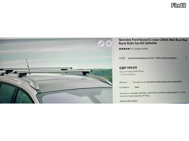 UUSI alkuperäinen tehtaanpaketissa oleva käyttämätön Ford C-Max katto/takkateline sopii 2010-2019 mallisiin. Kuten kuvasta näet hinta on 229,43€ mutta tämän saat 150€/netto. Nyt kannattaa olla nopea, ei varauksia vaan ensimmäiselle myyn. Tarvittaessa voin myös lähettää postimaksua vastaan. Parhaiten mut tavoittaa numerosta 0503556677 soitto/viesti
