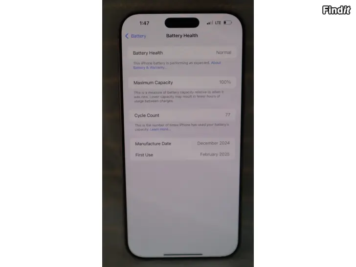 Akun kunto 100 valmistettu 12/2024, ensikäyttö 2/2025, vain 77 lataussykliä.