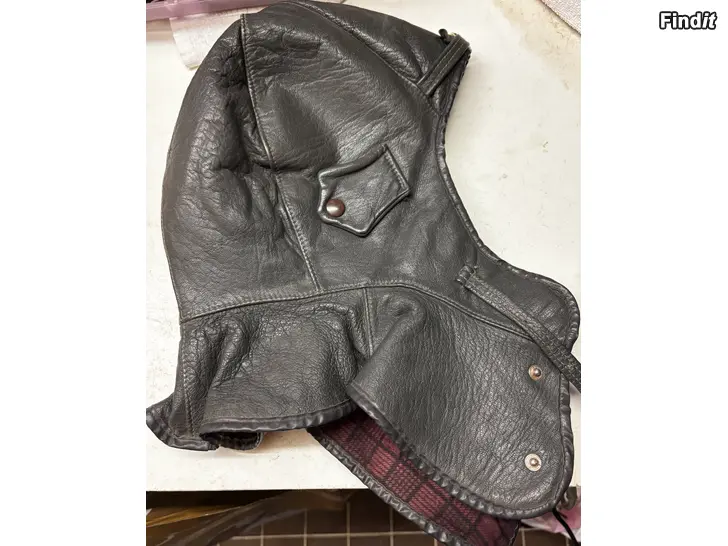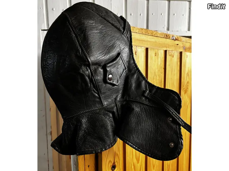 Nahkakypärä, vuorellinen. Koko merkintää ei näkyvillä mutta aikuisen päähän sopiva.