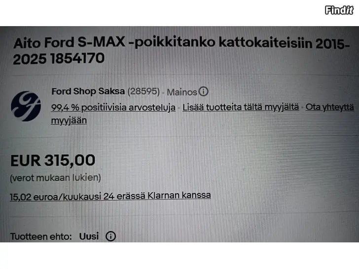 HUOM! Puoleen hintaan! UUSI alkuperäinen tehtaanpaketissa oleva käyttämätön Ford C-Max sekä Galaxy malleihin sopiva katto/takkateline vuosimallit 2015-2025. Kuten kuvasta näet hinta on 315€ mutta tämän saat alle puoleen hintaan 150€/netto. Nyt kannattaa olla nopea, ei varauksia vaan ensimmäiselle myyn. Lisään kuvia kun ehdin. Tarvittaessa voin myös lähettää postimaksua vastaan. Parhaiten mut tavoittaa numerosta 0503556677 soitto/viesti