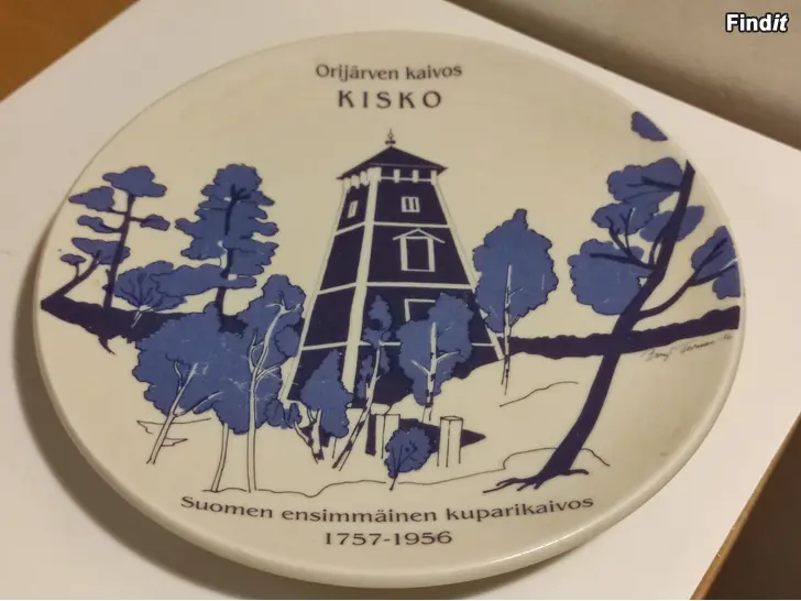 Arabia seinälautanen, Orijärven kaivos. Kisko. Suomen ensimmäinen kuparikaivos 1757-1956. Hyväkuntoinen. Valmistettu vain 300 kpl. Halkaisija 20cm. Edullisesti