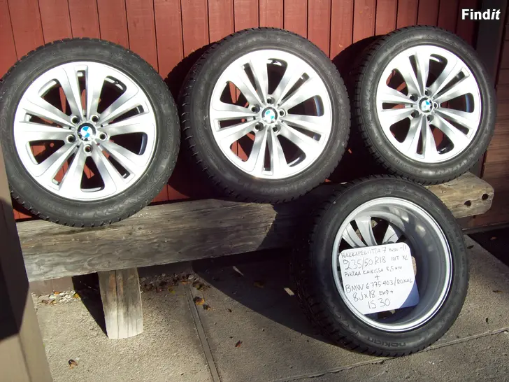Nokian Hakkapeliitta 7 nastarenkaat 235/50R18 101t XL, paistovuosi 2011, pintaa kaikissa tasaiset 8,5mm, nastat tallessa, ilmat pysyy. BMW:n style:234 osanumero: 6 775 403 orggisaluilla 8Jx18 et30, keskireikä 72.6mm, vanteet suorat ja siistit tehtaanvärissä keskimerkeillä. Säilytetty pimeässä, viileässä ja kuivassa kellarissa. EN lähetä.