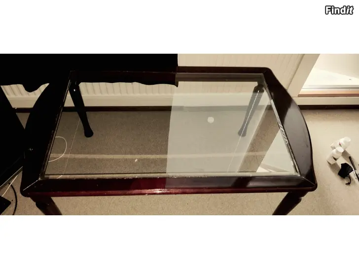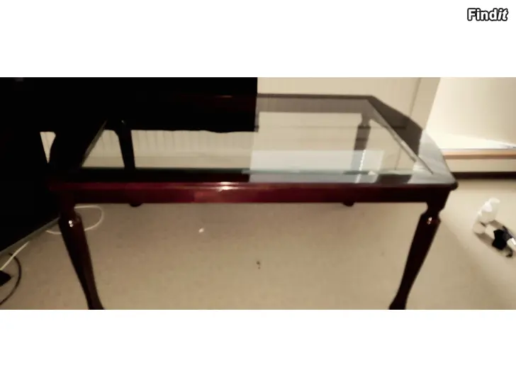 Olohuoneen lasinen pöytä hyvässä kunnossa ja hyvän näköisyä tummaa puuta kehys