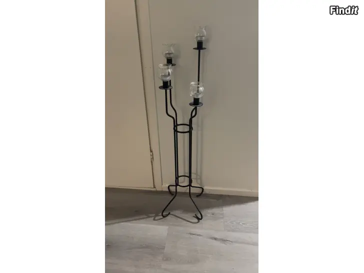 Metallinen, 4 kynttilälle. Mukana lasiset tuulisuojat. Hyväkuntoinen ja tukeva.