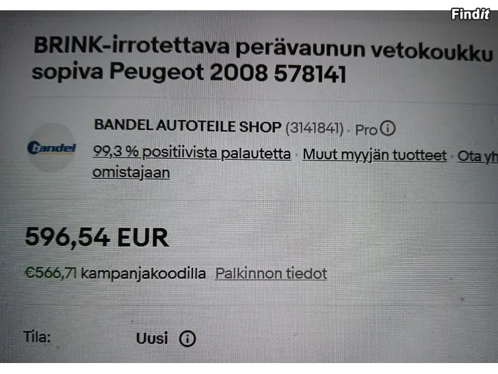 Tästä nyt reilusti alle PUOLEEN HINTAAN! UUSI käyttämätön ALKUPERÄINEN Peugeot 2008 vetokoukku tehtaanpaketissa joka sopii 2013-2020 mallisiin. Kuten kolmannesta kuvasta näet ovh. 596,54€ tämän saat 250€. Nyt kannattaa olla nopea, ei varauksia vaan ensimmäiselle myyn. Tarvittaessa voin myös lähettää postimaksua vastaan. Ps. Näillä kuvilla lisähuomiota, lisään kuvia kun ehdin tai lähetän ostajalle suoraan vaikka WhatsApp viestinä. Parhaiten mut tavoittaa numerosta 0503556677 soitto/viesti