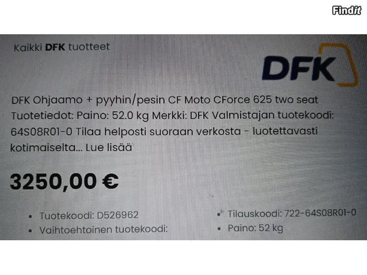 Findit ei vastaa ilmoitetusta tuotteesta tai ilmoituksen sisällöstä. SMS-viestien lähettäminen ilmoittajalle mainostarkoituksessa on kiellettyä. Ilmoittaja ei halua ilmoitus- ym. myyjien soittelevan. Jos sinulla on muuta kysyttävää tai mielipiteitä, ottakaa ystävällisesti yhteyttä asiakaspalveluumme.
