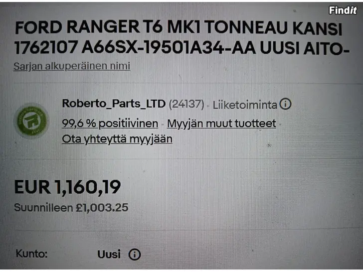 Uusi alkuperäinen tehtaanpaketissa oleva Fordin käyttämätön lavakate/peite Ford Ranger 2011- ja siitä eteenpäin oleviin vuosimalleihin. Kuten näet kuvasta 3 niin ovh. 1160,19€. Tämän saat puoleen hintaan 580€/netto. Voin myös lähettää Postin tai Matkahuollon kautta +38€. Toimi nopeasti, ei varauksia. Parhaiten mut tavoittaa numerosta 0503556677 soitto/viesti.