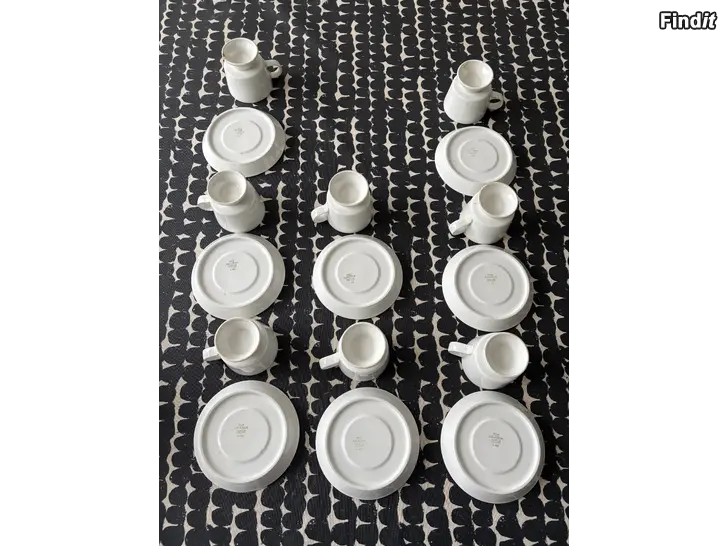 8 kappaletta Kaj Franckin Arabialle suunnittelemia valkoisia malli FC kahvikuppeja asetteineen. Malli FC tunnetaan Raija Uosikkisen Ali kuppien mallina.