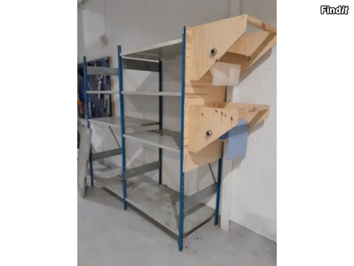 Plåthylla, höjd ca. 190cm, bredd 200cm, djup 45cm. Bp. 90€. Ställning för pappersrullar på gaveln.