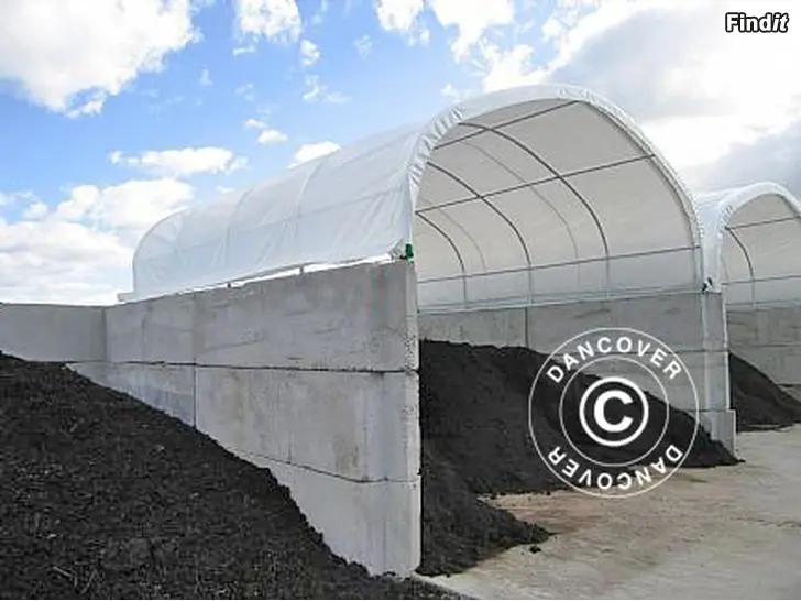 Stort containertält med ett robust 610 g/m2 PVC-överdrag och galvaniserade stålrör för ställningen. Montera det bågformade överdraget mellan två containers, låga väggar eller liknande för att skapa ett skyddat område för fordon, varor, material och mer. Containertältet är en populär och hållbar skyddslösning inom industri, byggarbete, jordbruk och andra fält.