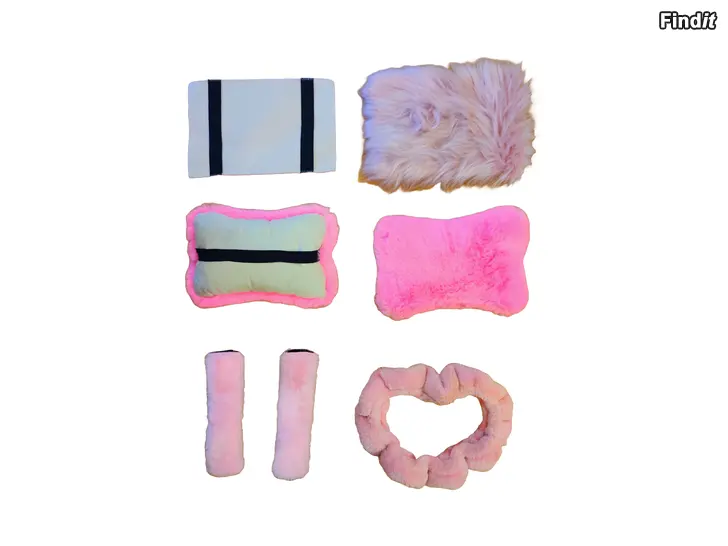 Pink my ride? :-D Myydään iso setti pinkki-väriset autotarvikkeet. Setissä lattiamatot, niskatuen tyynyt, konsolikannen peite, vyöpehmusteet, ratin suoja, vannetarroja, koukut, käsijarrukava sekä reunalistat esim. tuuletusaukolle. Kaikki kerralla. Hinta 25€