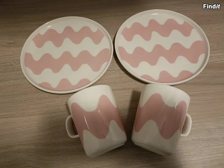 Valkoinen/vaaleanpunainen ja kunto erittäin hyvä. Yksi setti 25€ johon kuuluu kuppi sekä lautanen.