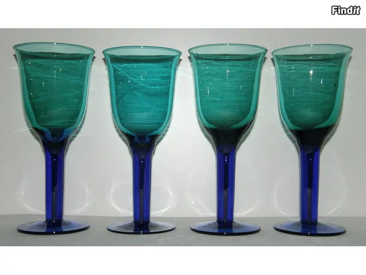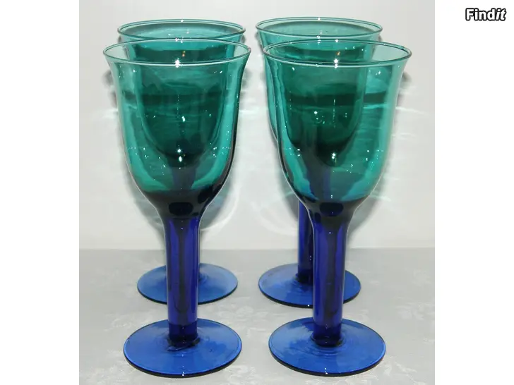 Hintaan sisältyvät kuvissa näkyvät jalalliset sinivihreät juomalasit 8 kpl. Korkeus 21,5 cm ja vetoisuus piripintaan täytettynä 4 dl.