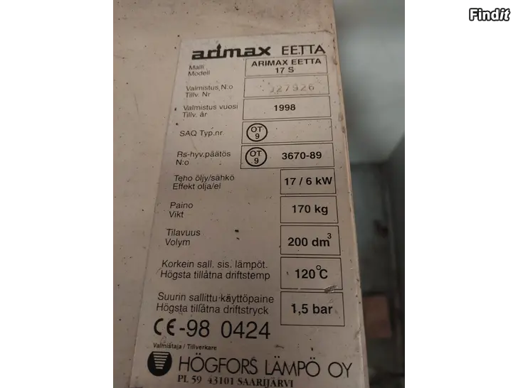 Myydään kuvan mukainen Arimax eetta 17S öljykattila vuosimallia 1998 ja Oilonin poltin junior LF1. Öljykattila on vielä käytössä ja puretaan viikolla 9 alkuviikosta. Hyvin toimiva öljykattila jossa myös sähkövastukset. Lämmitysteho öljyllä 17kW ja sähköllä 6kW. 200l vesisäiliö sisällä. Myydään lämmitysjärjestelmän uusimisen johdosta.